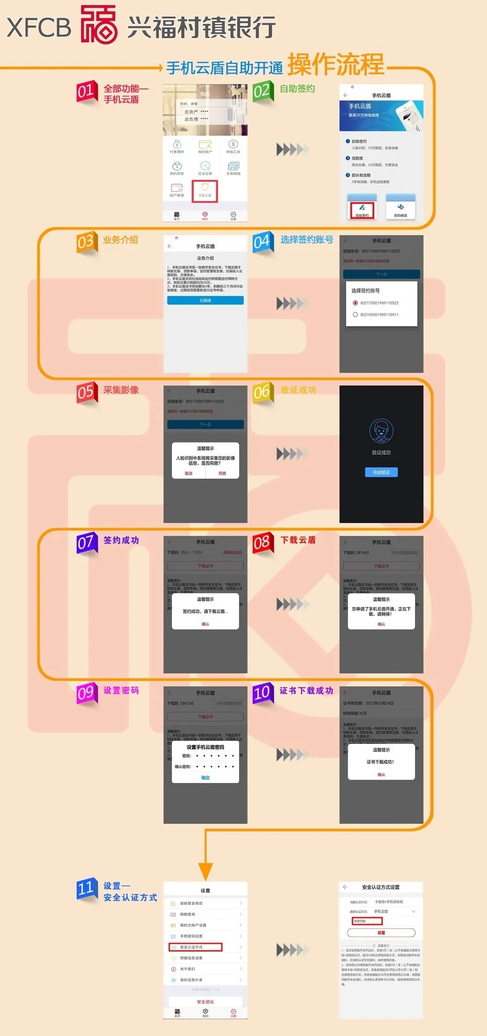 客户可通过柜面或手机银行自助办理完成云盾签约,签约完成后需在手机银行上下载证书。具体操作流程如下: